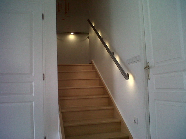 Pose d'éclairage de sources LED incorporées dans une rambarde en inox conçue sur-mesure pour l'escalier d'un particulier. Nous avons proposé et fabriqué l'ensemble.