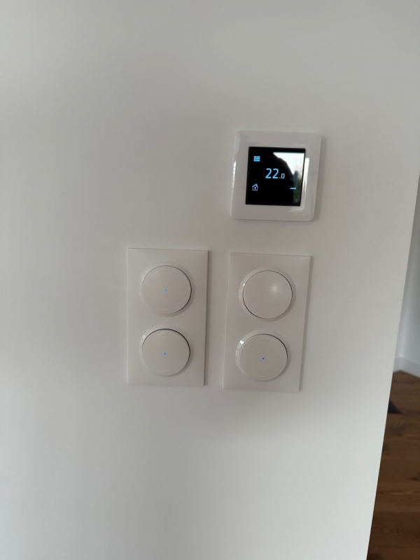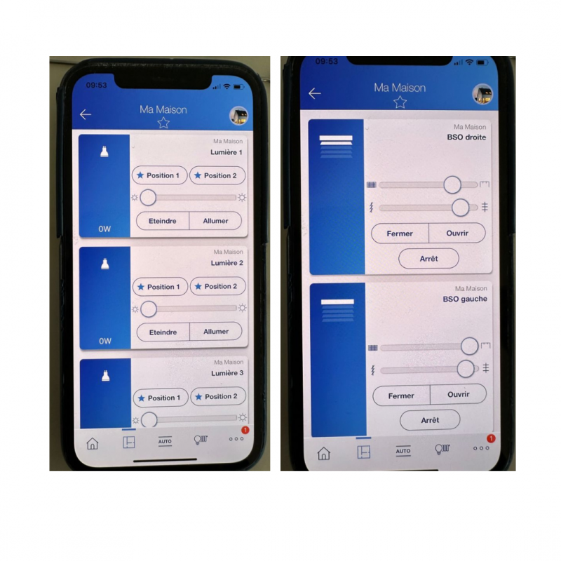 Commande et scénarisations des équipements via un smartphone depuis l'application Energeasy Connect. Pilotage de : 2 BSO (brise-soleil) 7 volets 4 éclairages en variation